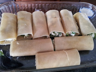 Lay out Noodle and place a spoon full of filling on one end of the noodle and roll up, then place in the baking dish. Continue to fill noodles until they are all full.